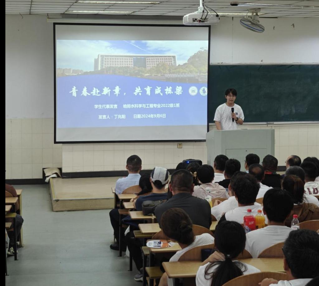 会议第三项,在校生代表、给排水科学与工程专业2022级丁兆阳同学结合自身在校学习、科研竞赛、社会实践等经历,分享了自己的大学生活并鼓励新生尽快适应大学生活、明确目标、勇于探索。