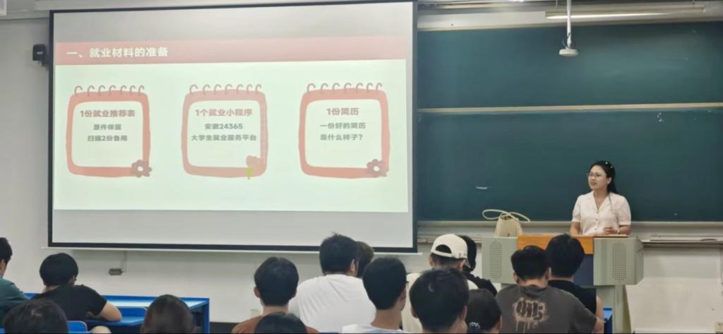 辅导员谢永芳结合当前就业市场形势与学院学科特点,强调了早准备、早规划、早行动的重要性。在就业材料准备环节,提出了备好“三个1”的核心建议:精心打磨的1份简历,学校官方认证的1份就业推荐表,掌握1个就业小程序。通过对这“三个1”的规范解读与实例分析,辅导员帮助同学们明晰了求职材料准备的关键要点。