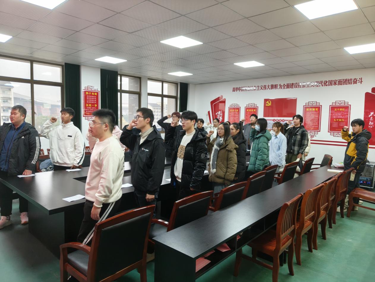 仪式在激昂的中华人民共和国国歌声中拉开序幕。会上,崔余龙向新团员表示热烈祝贺并提出希望:希望新发展的团员同学坚定理想信念,锤炼过硬本领,弘扬团的精神,做新风尚的引领者。随后,崔余龙带领全体新团员深入学习党的二十届四中全会精神,对全会提出的新概念、新观点、新论断进行了讲解。会议最后,在张艳冬同学的带领下,全体新团员集体宣誓。誓言铿锵有力,字字千钧,不仅是新团员对团组织的郑重承诺,更彰显了他们立志以青春之力报效国家的坚定决心,激昂的声音在会议室内久久回荡。