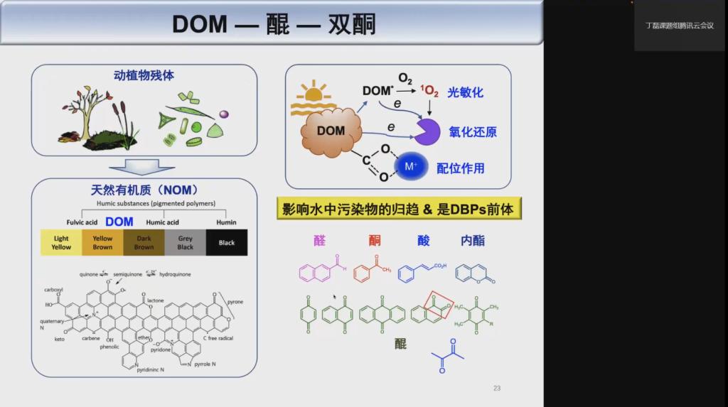 报告从“小分子双酮是什么?”、“小分子双酮从哪里来?”、“小分子双酮到哪去?”三个角度分析了小分子双酮的结构特点、理化性质、对水污染的影响等,并从光致吸附、光致降解、酶促转化和混凝沉淀等多个方面讲述了小分子双酮在界面过程和化学转化中对电子和能量转移的调控作用,首次提出了小分子双酮在水污染物降解过程中的可以同时起到催化氧化、还原的作用,并基于此阐述了小分子双酮在水污染控制中的应用潜力和科学内涵,为后续水污染控制技术做了展望。会上,张淑娟教授详细解答了与会老师和学生提出的各类问题,积极引导了学生们如何开展学习、科学研究、问题思考与分析等能力的提升,取得了较好的学术交流效果。